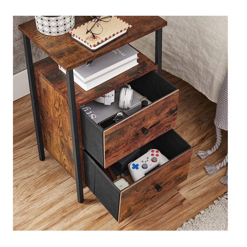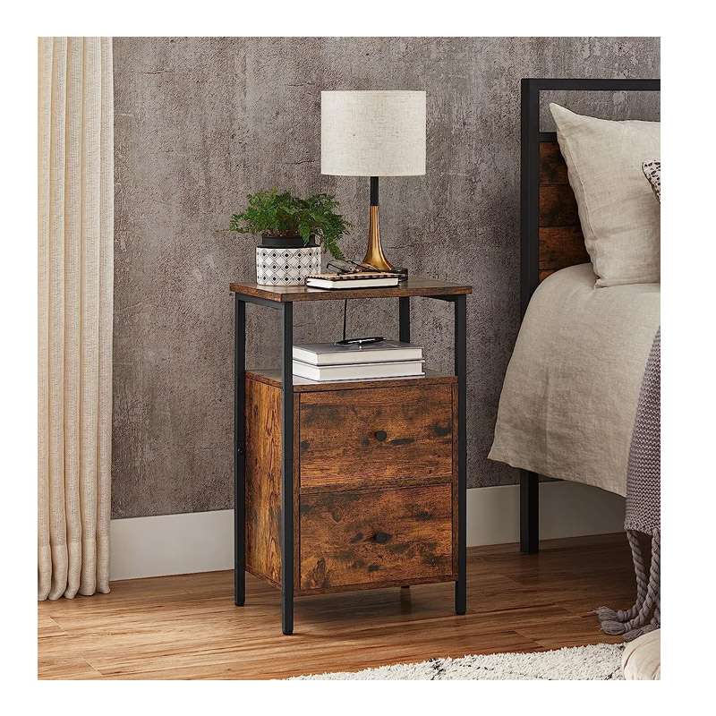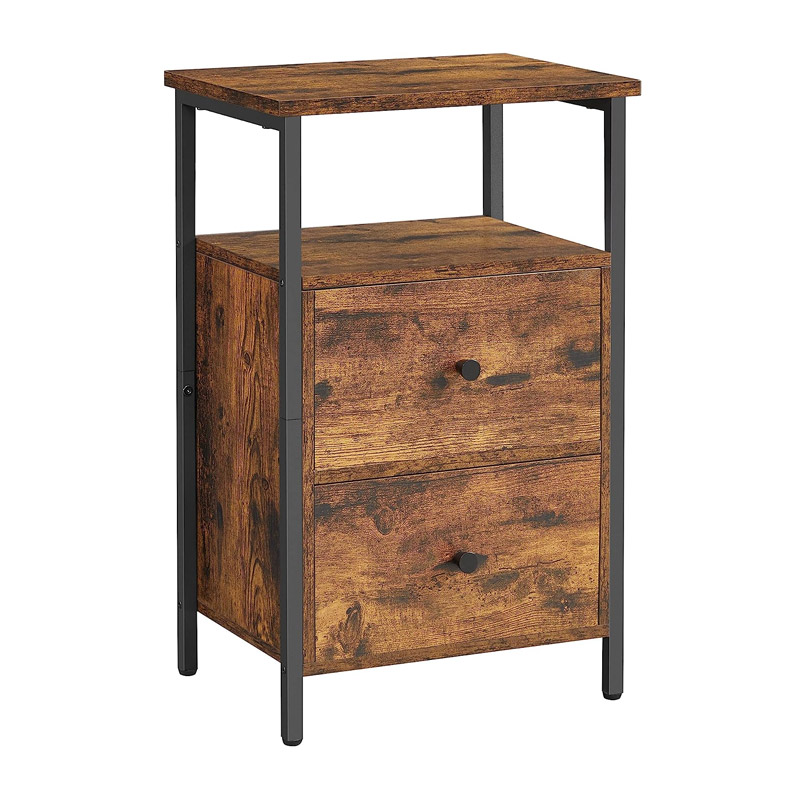 Το κομοδίνο, από την εταιρία VASAGLE, διαθέτει μεταλλικό σκελετό από ατσάλι και επιφάνειες από MDF ξύλο. Εξοπλισμένο με 2 ευρύχωρα συρτάρια και 1 ράφι, προσθέτει μια πινελιά βιομηχανικής ατμόσφαιρας στην κρεβατοκάμαρά σας
