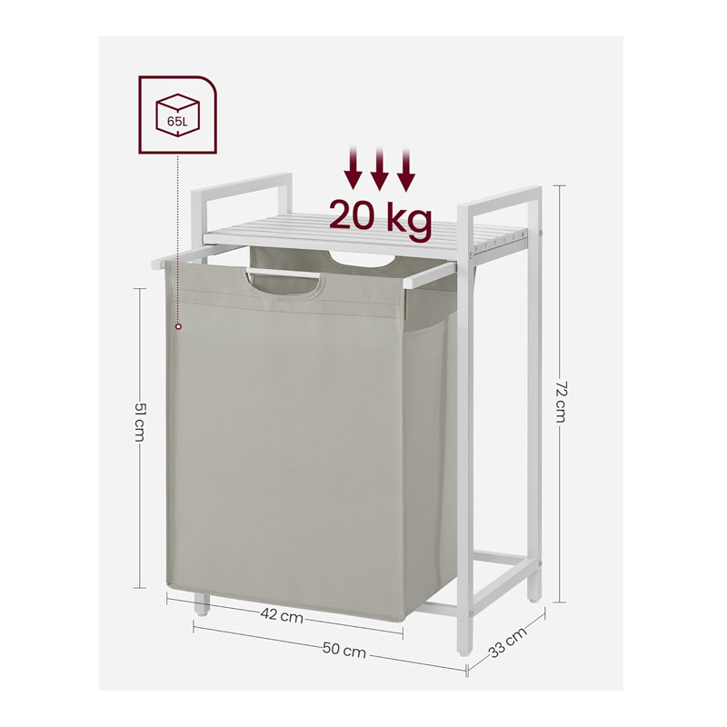 Το καλάθι απλύτων, από την εταιρία VASAGLE, είναι ιδανικό για την για την οργάνωση των άπλυτων ρούχων στο μπάνιο. Διαθέτει ατσάλινο πλαίσιο και 1 σάκο για τα ρούχα συνολικής χωρητικότητας 65 Lt. Στο πάνω μέρος έχει διάτρητο ράφι από MDF, παρέχοντας επιπλέον χώρο για την οργάνωση απορρυπαντικών ή προϊόντων περιποίησης.