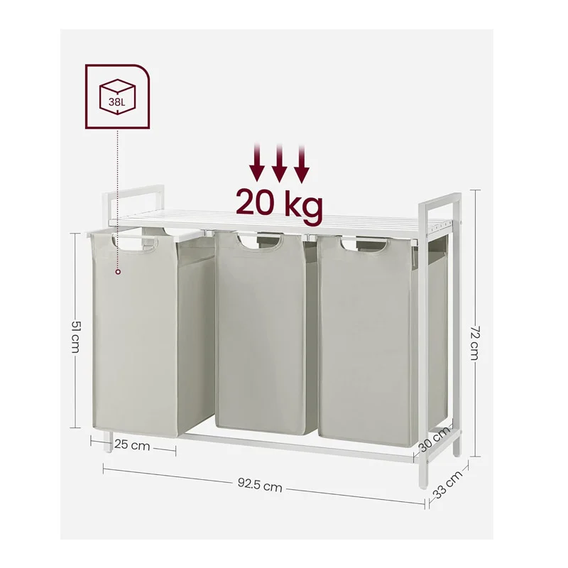 Το καλάθι, από την εταιρία VASAGLE, είναι ιδανικό για την για την οργάνωση των άπλυτων ρούχων στο μπάνιο. Διαθέτει ατσάλινο πλαίσιο και 3 χώρους συνολικής χωρητικότητας 114 Lt. Ο σχεδιασμός 3 τμημάτων του σας επιτρέπει να οργανώνετε τα ρούχα σας ανά τύπο και να διαχωρίζετε τα ανοιχτόχρωμα από τα σκούρα. Στο πάνω μέρος έχει διάτρητο ράφι από MDF, παρέχοντας επιπλέον χώρο για την οργάνωση απορρυπαντικών ή προϊόντων περιποίησης.