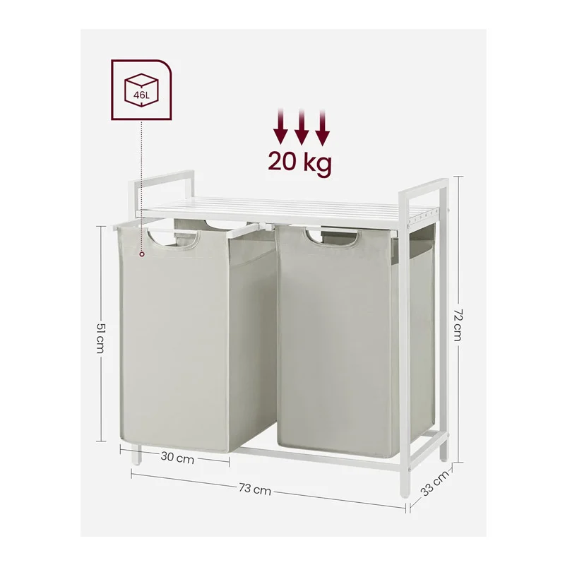 Το καλάθι, από την εταιρία VASAGLE, είναι ιδανικό για την για την οργάνωση των άπλυτων ρούχων στο μπάνιο. Διαθέτει ατσάλινο πλαίσιο και 2 χώρους συνολικής χωρητικότητας 96 Lt. Ο σχεδιασμός 2 τμημάτων του σας επιτρέπει να οργανώνετε τα ρούχα σας ανά τύπο και να διαχωρίζετε τα ανοιχτόχρωμα από τα σκούρα. Στο πάνω μέρος έχει διάτρητο ράφι από MDF, παρέχοντας επιπλέον χώρο για την οργάνωση απορρυπαντικών ή προϊόντων περιποίησης.