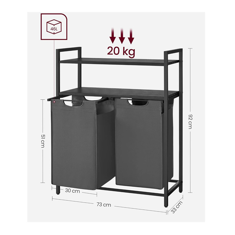 Το καλάθι, από την εταιρία VASAGLE, είναι ιδανικό για την για την οργάνωση των άπλυτων ρούχων στο μπάνιο. Διαθέτει ατσάλινο πλαίσιο και 2 χώρους συνολικής χωρητικότητας 92 Lt. Ο σχεδιασμός 2 τμημάτων του σας επιτρέπει να οργανώνετε τα ρούχα σας ανά τύπο και να διαχωρίζετε τα ανοιχτόχρωμα από τα σκούρα. Με 2 διάτρητα ράφια από MDF που παρέχουν επιπλέον χώρο για τα προϊόντα περιποίησης ή τα απορρυπαντικά σας.