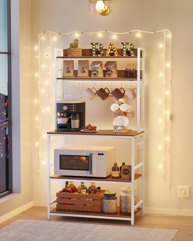 Αυτό το ράφι όλα-σε-ένα με 5 ράφια για τον φούρνο μικροκυμάτων, την καφετιέρα, τη φριτέζα και άλλες συσκευές, 14 S-σχήματος γάντζους για να κρεμάτε κούπες ή κουτάλια στην πλάκα πλέγματος ή στις πλαϊνές μπάρες, φέρνει τάξη στην κουζίνα σας!