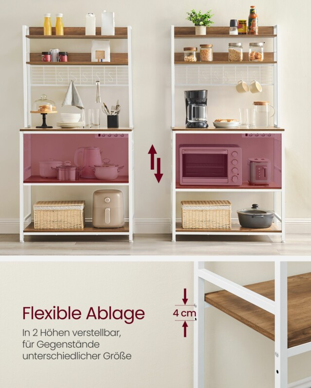 Το μεσαίο ράφι (μέγιστη χωρητικότητα φορτίου 130 lbs) αυτού του ραφιού κουζίνας μπορεί να ρυθμιστεί πάνω ή κάτω κατά 1.6 ίντσες, επιτρέποντάς σας να φιλοξενήσετε σκεύη διαφορετικού μεγέθους, από μικρή τοστιέρα μέχρι μπλέντερ και φούρνο μικροκυμάτων.