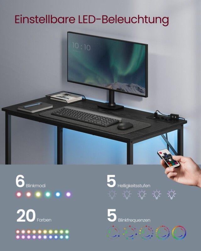 • Δημιουργήστε Gaming Διάθεση: Το LED gaming γραφείο διαθέτει ενσωματωμένη λωρίδα φωτισμού με 20 χρώματα, 6 τρόπους αναβοσβήματος, 5 επίπεδα φωτεινότητας και 5 ταχύτητες αναβοσβήματος. Κάντε τον χώρο σας πιο αισθητικό και πιο φιλικό προς τον χρήστη.