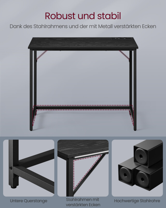 • Σταθερό και Στιβαρό: Με το ατσάλινο πλαίσιο, τις ενισχυμένες κάτω δοκούς και τις τριγωνικές ενισχύσεις, αυτό το γραφείο υποστηρίζει έως και 100 κιλά. Τα ρυθμιζόμενα πόδια εξασφαλίζουν σταθερότητα σε ανώμαλα δάπεδα.