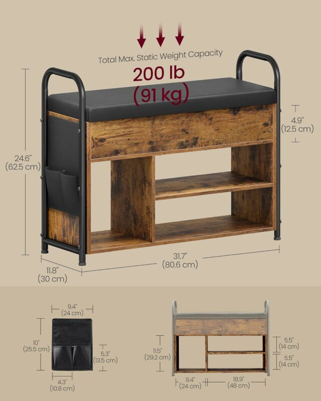 VASAGLE Πάγκος Παπουτσιών με Αποθηκευτικό Χώρο και Πλαϊνές Τσέπες 80.6x30x62.5εκ LSB052K01