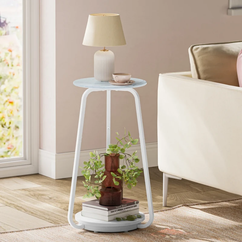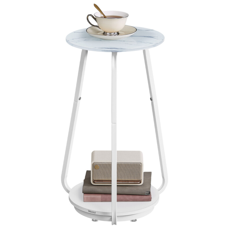 Προσθέστε στυλ και λειτουργικότητα στον χώρο σας με το βοηθητικό τραπεζάκι Vasagle LET287B58. Ο κομψός στρογγυλός σχεδιασμός του και η επιφάνεια με εφέ μαρμάρου σε λευκό χρώμα το καθιστούν ιδανικό για το σαλόνι, την κρεβατοκάμαρα ή οποιονδήποτε άλλο χώρο. Διαθέτει μεταλλικό σκελετό για σταθερότητα, γυάλινη επιφάνεια διαμέτρου 30cm και ράφι από μοριοσανίδα (28.5cm) για επιπλέον αποθηκευτικό χώρο.