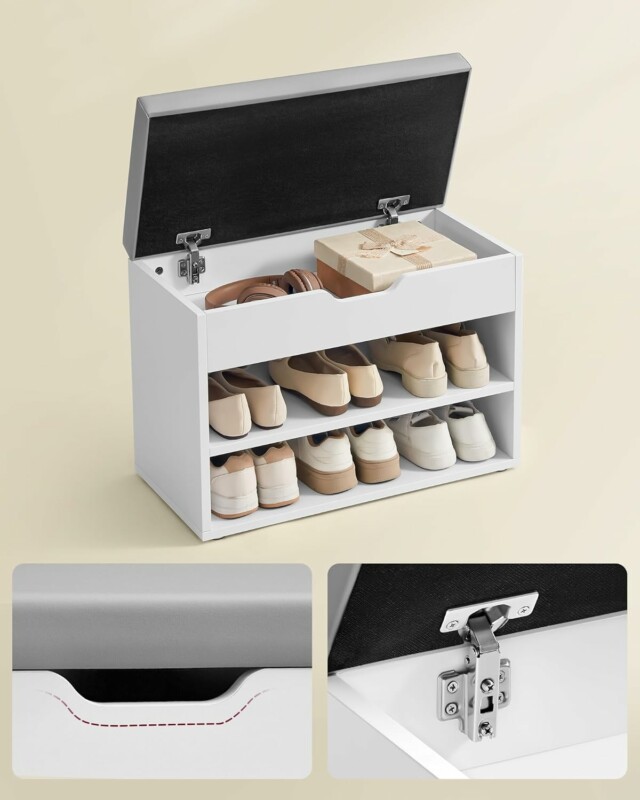 Αυτός ο στιβαρός πάγκος παπουτσιών με αποθηκευτικό χώρο είναι κατασκευασμένος από υψηλής ποιότητας μοριοσανίδα και υποστηρίζει έως 136 kg. Δεν κουνιέται ούτε τρίζει και θα σας συνοδεύει για πολλά χρόνια.