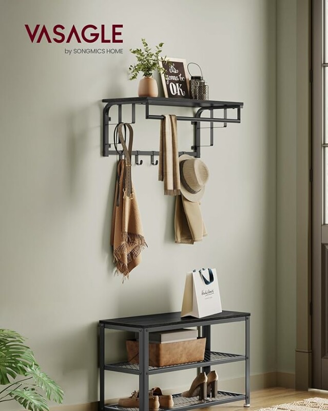 VASAGLE Κρεμάστρα Τοίχου με Ράφι, Ράβδο και Γάντζους σε Γκριζομαύρο Χρώμα 66x30x27 εκ. LCR012B13