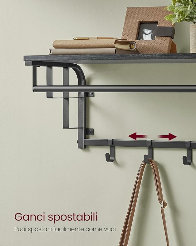 Αυτό το κρεμάστρα συνδυάζει 1 ράφι 30 x 66 cm, 1 ράβδο κρεμάσματος και 5 αφαιρούμενους γάντζους για να οργανώσετε όλες τις ανάγκες σας. Παλτά, τσάντες, ομπρέλες, κλειδιά… όλα μπορούν να βρουν τη θέση τους!
