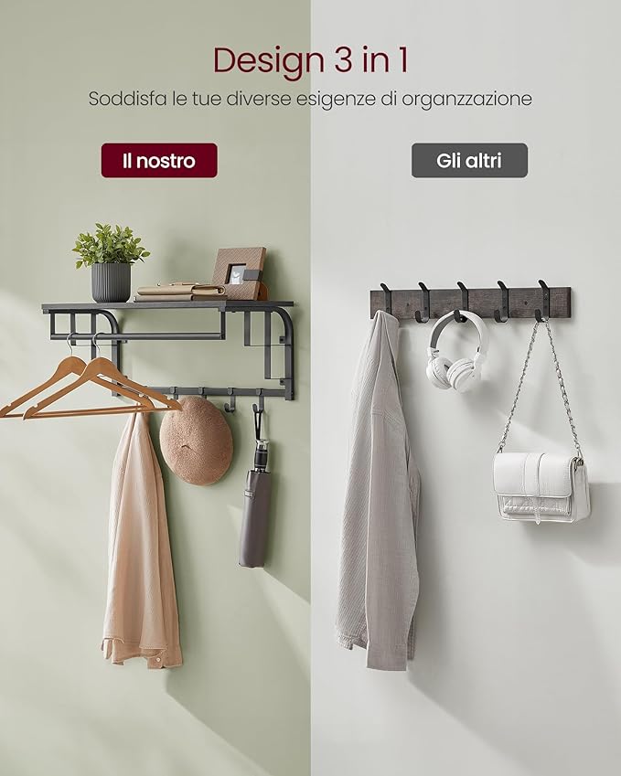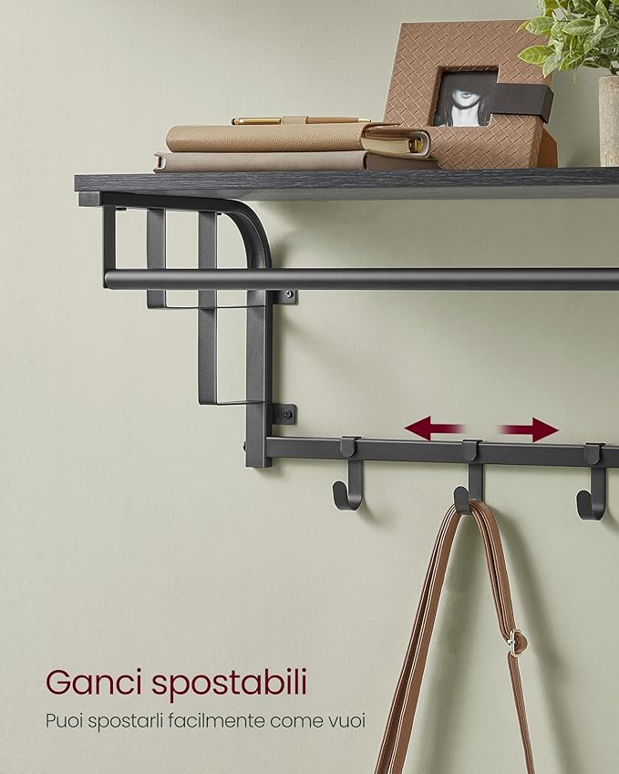 VASAGLE Κρεμάστρα Τοίχου με Ράφι, Ράβδο και Γάντζους σε Γκριζομαύρο Χρώμα 66x30x27 εκ. LCR012B13