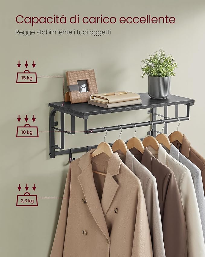 Ο συνδυασμός χάλυβα και μοριοσανίδας καθιστά αυτή την σταθερή κρεμάστρα ικανή να αντέχει έως 15 kg στο ράφι, 10 kg στη ράβδο και 2,3 kg σε κάθε γάντζο.
