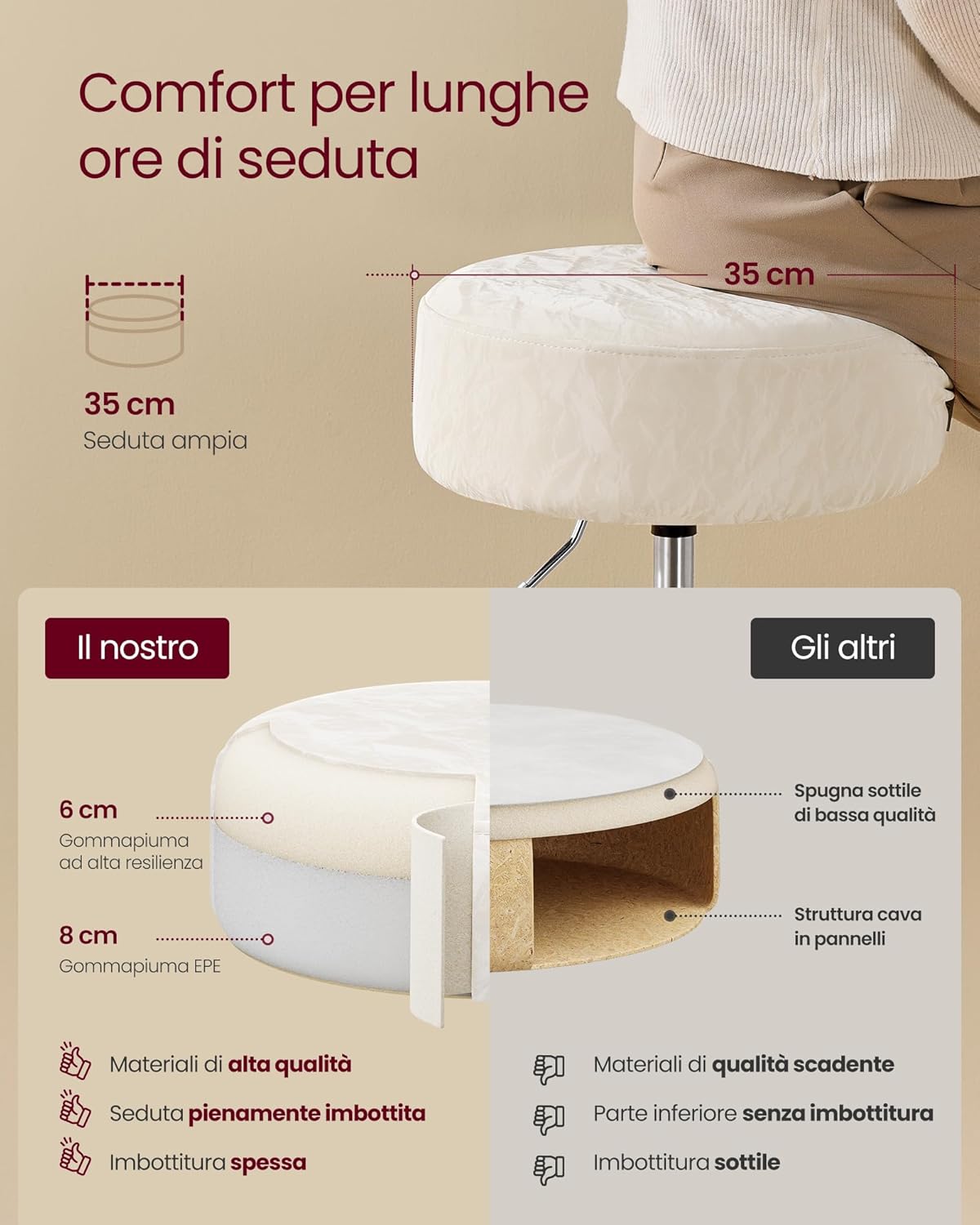 Χάρη στη διάμετρο καθίσματος 35 cm και την πλούσια επένδυση πάχους 14 cm, θα παραμένετε άνετοι ακόμα και μετά από πολλές ώρες χρήσης.