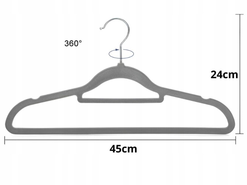 Κάθε κρεμάστρα διαθέτει ισχυρό μεταλλικό γάντζο που περιστρέφεται 360°, διευκολύνοντας το κρέμασμα των ρούχων σε οποιαδήποτε κατεύθυνση. Χάρη στην επιφάνεια βελούδου, ακόμα και οι μπλούζες, φορέματα ή πουκάμισα μένουν στη θέση τους. Πρόσθετες εγκοπές στα πλάγια επιτρέπουν την ανάρτηση λουριών, προσφέροντας ευελιξία στη χρήση.