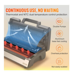 Με τον ισχυρό κινητήρα και την προηγμένη βάση αλουμινίου, παρέχει γρήγορη και αποτελεσματική απαγωγή θερμότητας, επιτρέποντας τη συνεχή σφράγιση χωρίς την ανάγκη συχνών διακοπών. Επιπλέον, με τα πρόσθετα μέτρα ασφαλείας ενός θερμοστάτη και της προστασίας διπλού ελέγχου θερμοκρασίας NTC, μπορείτε να απολαύσετε την ηρεμία κατά τη χρήση του.