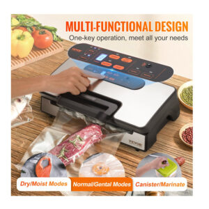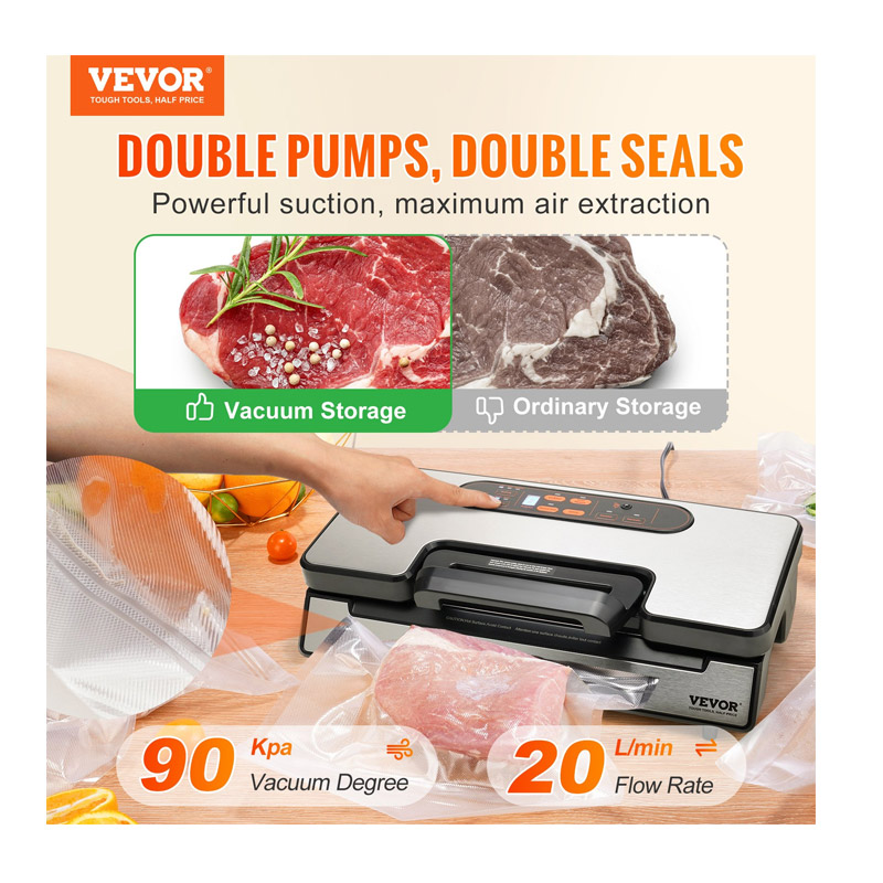 Η συσκευή σφραγίσματος τροφίμων, από την εταιρία VEVOR, έχει σχεδιαστεί με δύο αντλίες κενού για την παροχή μέγιστης αναρρόφησης και δύο λωρίδες σφράγισης για εξασφάλιση αεροστεγής συσκευασίας. Διατηρήστε εύκολα το φαγητό σας φρέσκο και απαλλαγμένο από βακτήρια.