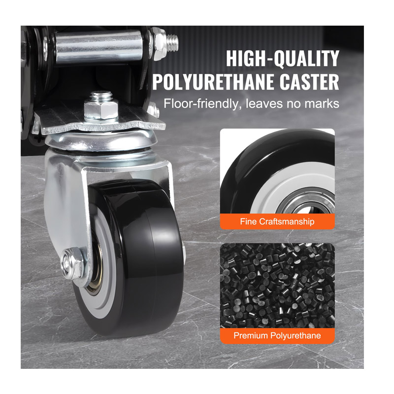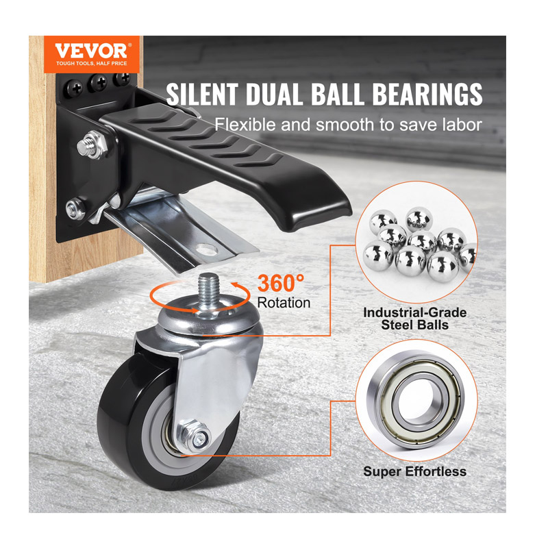 Το σετ, από την εταιρία VEVOR, αποτελείται από 4 περιστρεφόμενους τροχούς 360° βαρέως τύπου, κατάλληλοι για πάγκους εργασίας, ντουλάπια εργαλείων, μεγάλα έπιπλα, καρότσια και πολλά άλλα. Μπορείτε απλά να πατήσετε το πεντάλ του τροχού με το ένα πόδι για να σηκώσετε τον πάγκο εργασίας ή τον εξοπλισμό από το έδαφος (3/4″), επιτυγχάνοντας γρήγορη και εύκολη κίνηση.