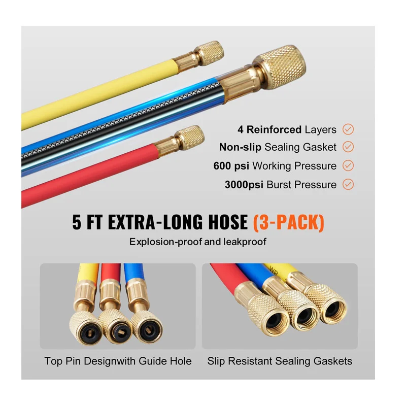 Το σετ, από την εταιρία VEVOR, είναι συμβατό με ψυκτικά R134A, R12, R22 και R502 και είναι κατάλληλο για HVAC αυτοκινήτου, οικιακό κλιματισμό και συντήρηση ψυγείου. Οι εξαιρετικά μεγάλοι σωλήνες φρέον διατίθενται σε σετ των τριών και είναι κατασκευασμένοι από PVC με τέσσερα ενισχυμένα στρώματα. Μπορούν να αντέξουν πιέσεις έως και 600 PSI, με πίεση διάρρηξης 3000 PSI.