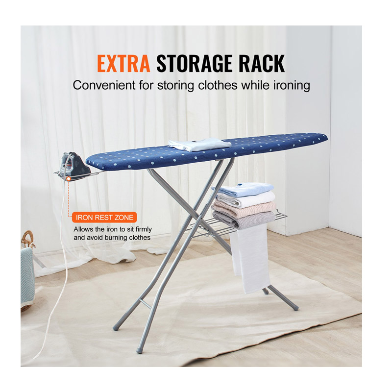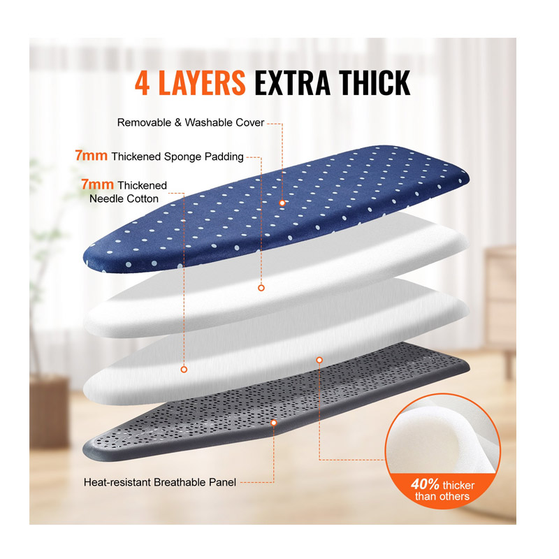 Η σιδερώστρα, από την εταιρία VEVOR, ξεχωρίζει με το σχέδιο 4 στρώσεων. Διαθέτει αναπνεύσιμο πάνελ ανθεκτικό στη θερμότητα, βαμβακερό στρώμα πάχους 7 mm, στρώμα πλήρωσης σφουγγαριού πάχους 7 mm και αφαιρούμενο κάλυμμα. Το ανθεκτικό στη θερμότητα επάργυρο κάλυμμα, εξασφαλίζει λεία αποτελέσματα χωρίς ζάρες, ενώ δίνει προτεραιότητα στην ασφάλειά σας. Ακόμα κι αν αφήσετε το σίδερο πάνω του δεν υπάρχει κίνδυνος να καταστραφεί.