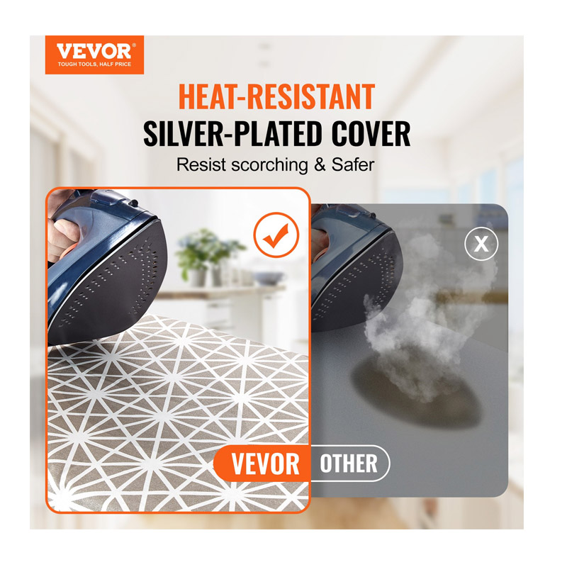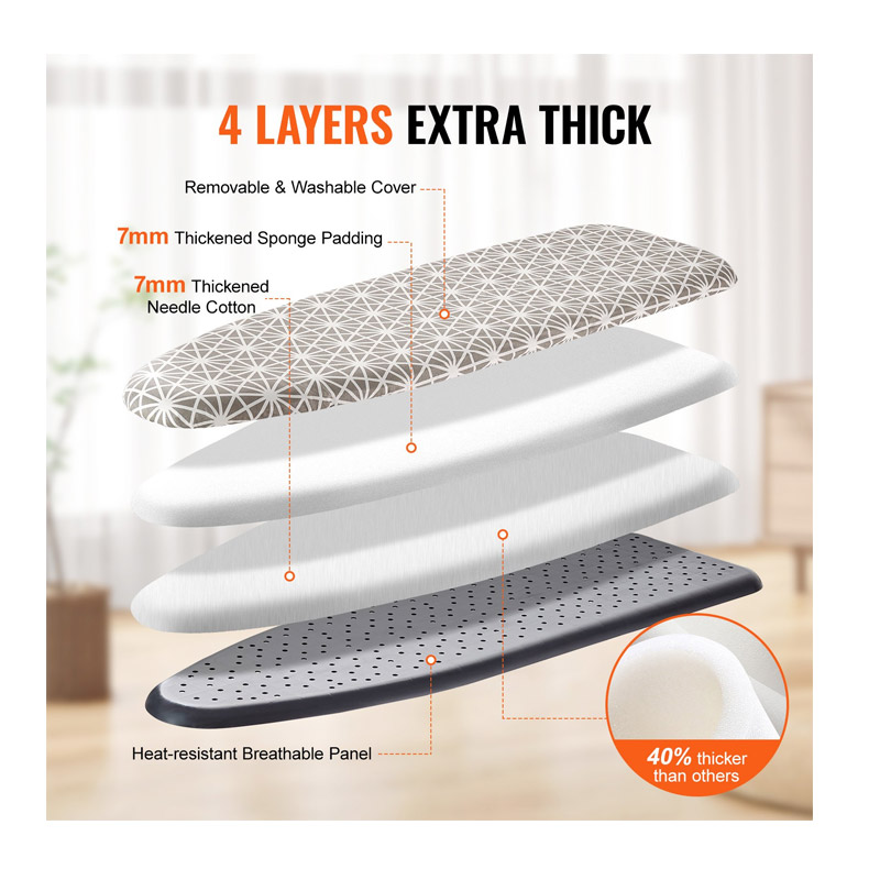 Η σιδερώστρα, από την εταιρία VEVOR, ξεχωρίζει με το σχέδιο 4 στρώσεων. Διαθέτει αναπνεύσιμο πάνελ ανθεκτικό στη θερμότητα, βαμβακερό στρώμα πάχους 7 mm, στρώμα πλήρωσης σφουγγαριού πάχους 7 mm και αφαιρούμενο κάλυμμα. Το ανθεκτικό στη θερμότητα επάργυρο κάλυμμα, εξασφαλίζει λεία αποτελέσματα χωρίς ζάρες, ενώ δίνει προτεραιότητα στην ασφάλειά σας. Ακόμα κι αν αφήσετε το σίδερο πάνω του δεν υπάρχει κίνδυνος να καταστραφεί.