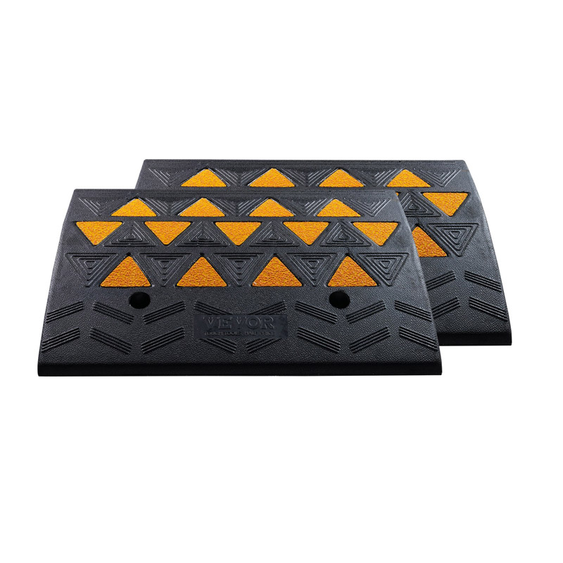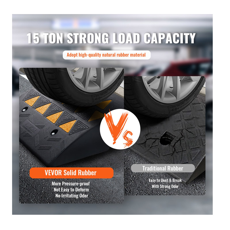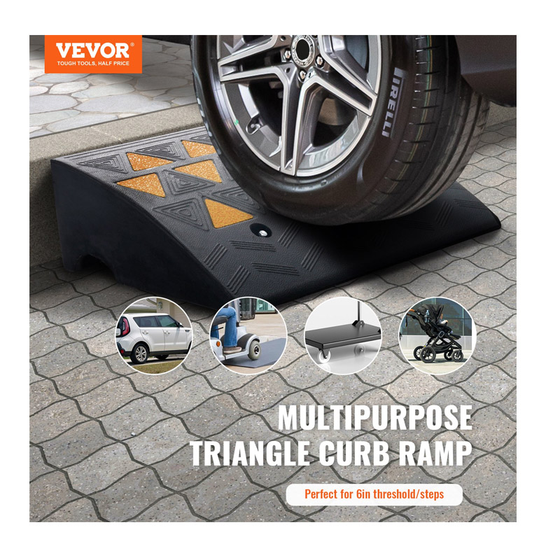 Το σετ, από την εταιρία VEVOR, αποτελείται από 2 ελαστικές ράμπες, που επιτρέπουν στα οχήματά σας, τα αναπηρικά καροτσάκια και τα καρότσια να ανεβαίνουν εύκολα στο πεζοδρόμιο. Είναι κατασκευασμένες από υψηλής ποιότητας συμπαγές φυσικό καουτσούκ, το οποίο έχει ισχυρή αντοχή και δεν παραμορφώνεται εύκολα και μπορεί να σηκώσει έως και 15 τόνους βαρέων οχημάτων.