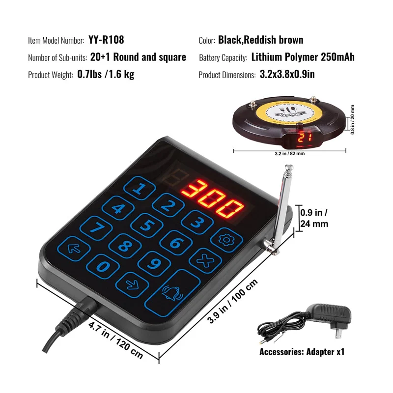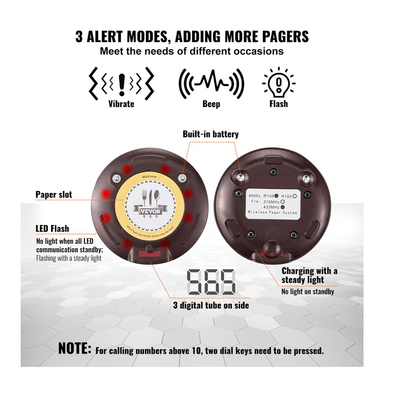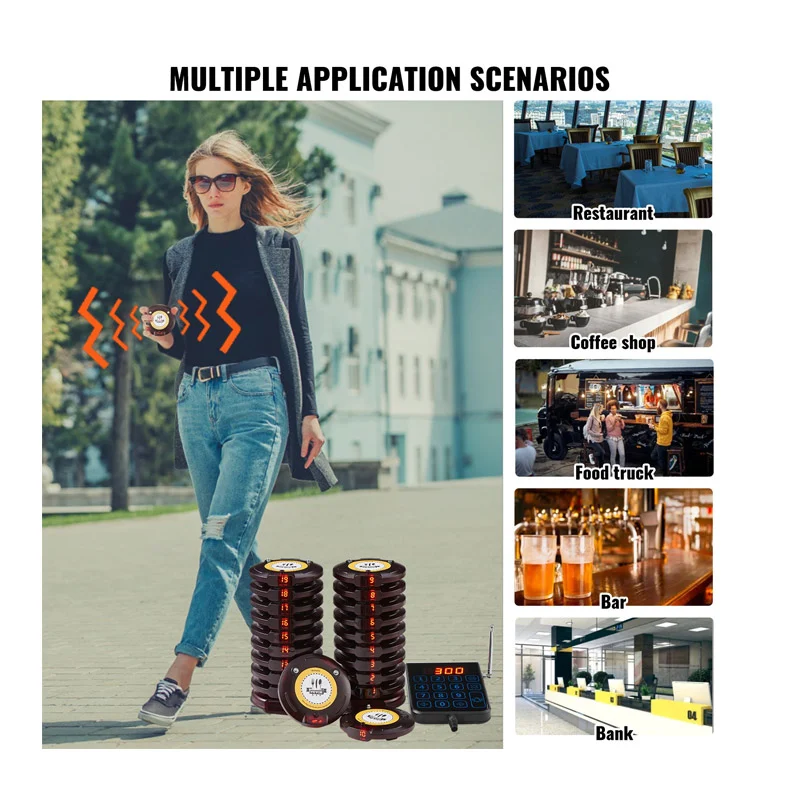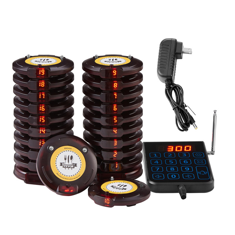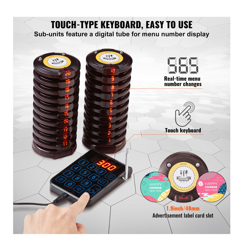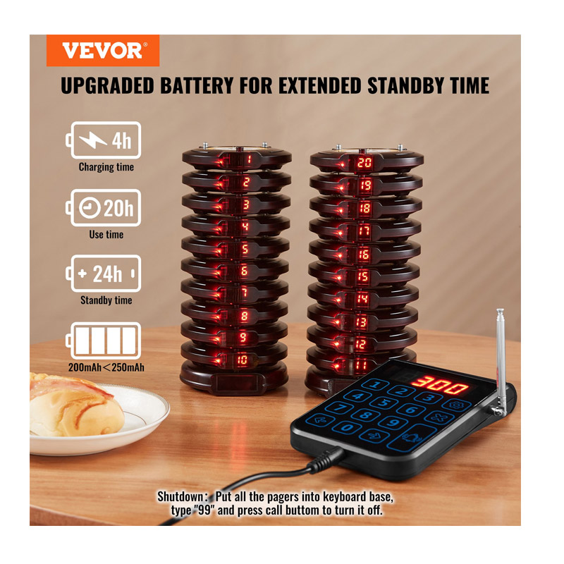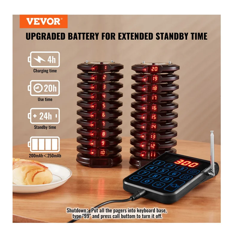 Το ασύρματο σύστημα ειδοποίησης έτοιμης παραγγελίας πελατών, από την εταιρία VEVOR, αποτελείται από μία βάση κλήσεων ασύρματου πληκτρολογίου 999 καναλιών και 20 ασύρματες συσκευές. Επιτρέπει την αποφυγή του χάους του προσωπικού, τη διατήρηση της κοινωνικής απόστασης και τη βελτίωση της αποδοτικότητας της εργασίας. Χρησιμοποιείται ευρέως σε εστιατόρια, ξενοδοχεία, νοσοκομεία και καφετέριες. Διαθέτει μια πρόσφατα αναβαθμισμένη μπαταρία πολυμερούς λιθίου 250 mAh, με χρόνο αναμονής έως και 24 ώρες. Υποστηρίζει πολλαπλούς κύκλους φόρτισης, καλύπτοντας τις καθημερινές ανάγκες χρήσης των εστιατορίων. Οι επιστρεφόμενες συσκευές δεν χρειάζεται να τοποθετηθούν στη βάση, επιτρέποντας πιο ευέλικτη διάταξη.