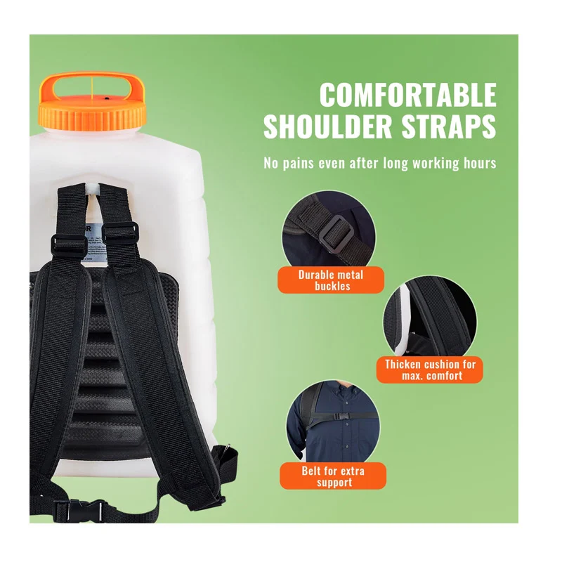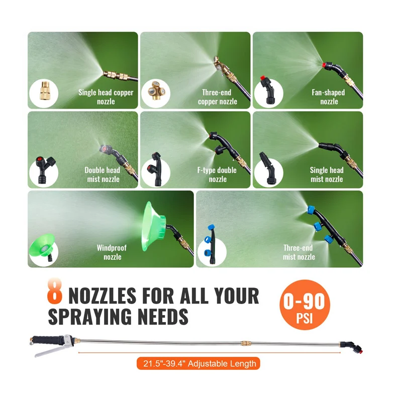 Ο ψεκαστήρας διαθέτει 8 ακροφύσια και 2 ράβδους, δίνοντάς σας περισσότερες επιλογές για να επιλέξετε τον τρόπο ψεκασμού. Το μεταλλικό ραβδί διαθέτει ρυθμιζόμενο μήκος 54.5 – 100 cm και το πλαστικό ραβδί είναι κατάλληλο για λευκαντικούς παράγοντες και άλλα διαβρωτικά υγρά. Η πίεση του νερού μπορεί να ρυθμιστεί εύκολα από 0 έως 90 PSI μέσω του κουμπιού. Εξοπλισμένος επίσης με ιμάντα ώμου για μέγιστη άνεση και φορητότητα. Οι διευρυμένοι ιμάντες και το μαξιλάρι που προστίθενται στην πλάτη βελτιώνουν την απαλότητα και την άνεση.