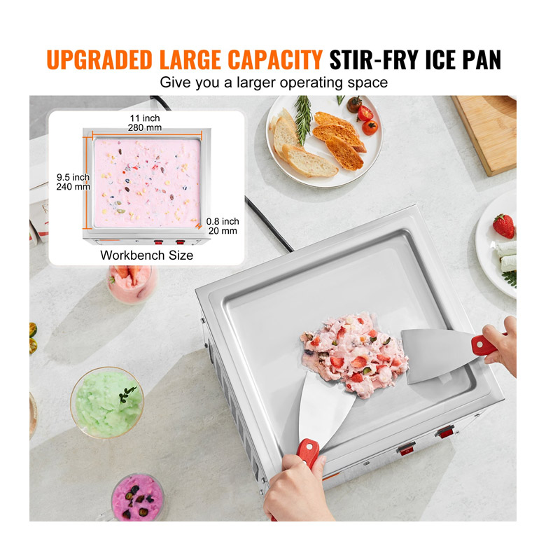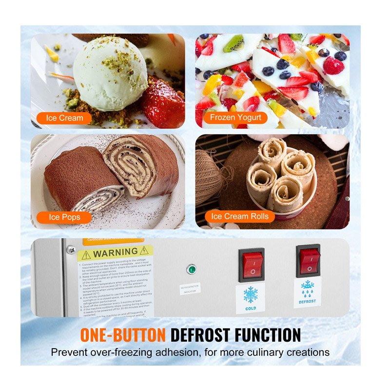 Διαθέτει ενσωματωμένο σύστημα χαλκού σωλήνα ψύξης σε σχήμα U, που εξαλείφει τις νεκρές γωνίες και βελτιώνει σημαντικά την απόδοση ψύξης. Η μεγάλη επιφάνεια εργασίας παρέχει άφθονο χώρο εργασίας και αποτρέπει τη διαρροή του προϊόντος. Η λειτουργία απόψυξης με ένα κουμπί αποτρέπει την υπερβολική ψύξη, αποτρέποντας το κόλλημα. Μπορείτε να δημιουργήσετε μια ποικιλία από παγωμένες λιχουδιές όπως παγωτό, παγωμένο γιαούρτι, μπάρες παγωτού και ρολά παγωτού.