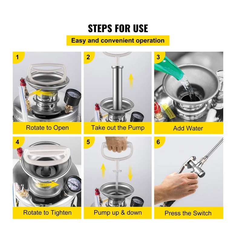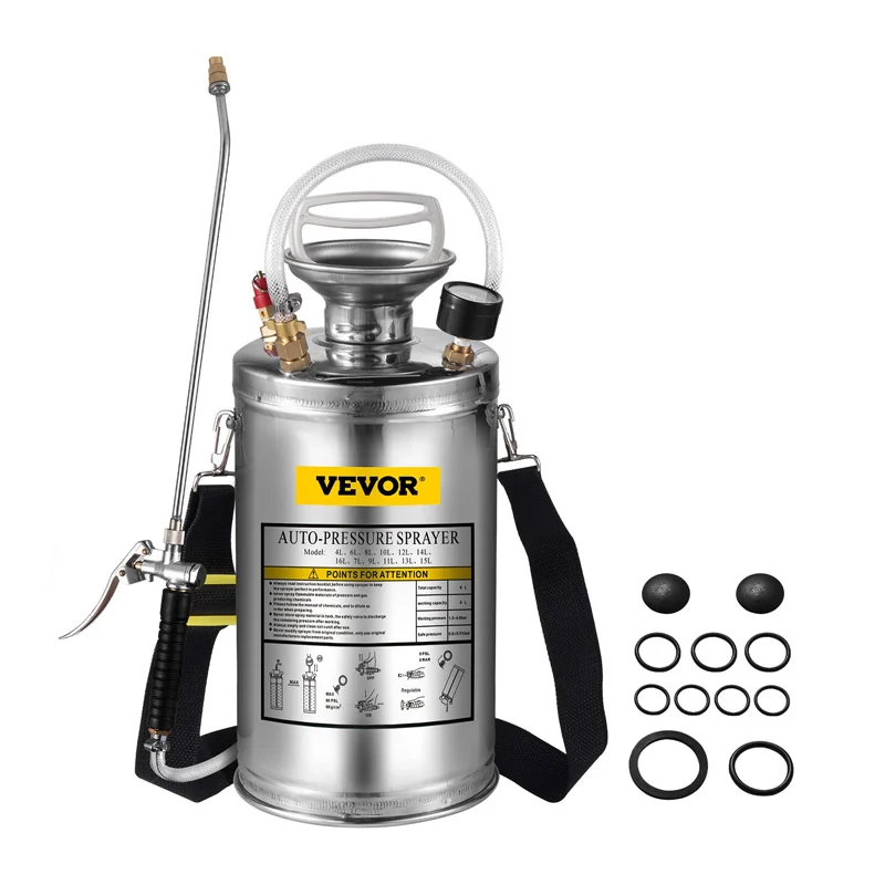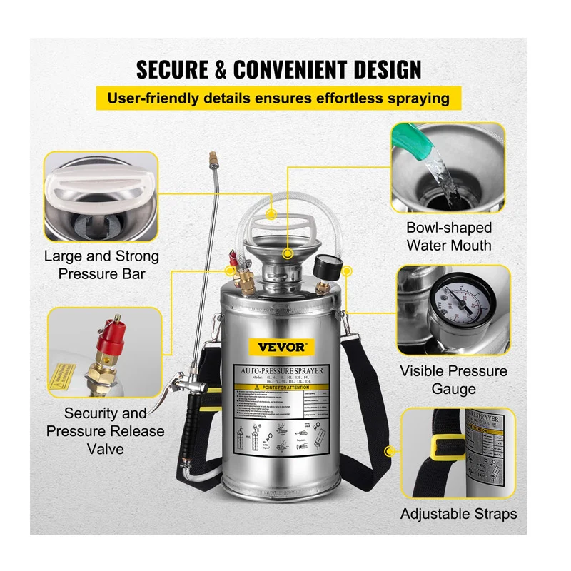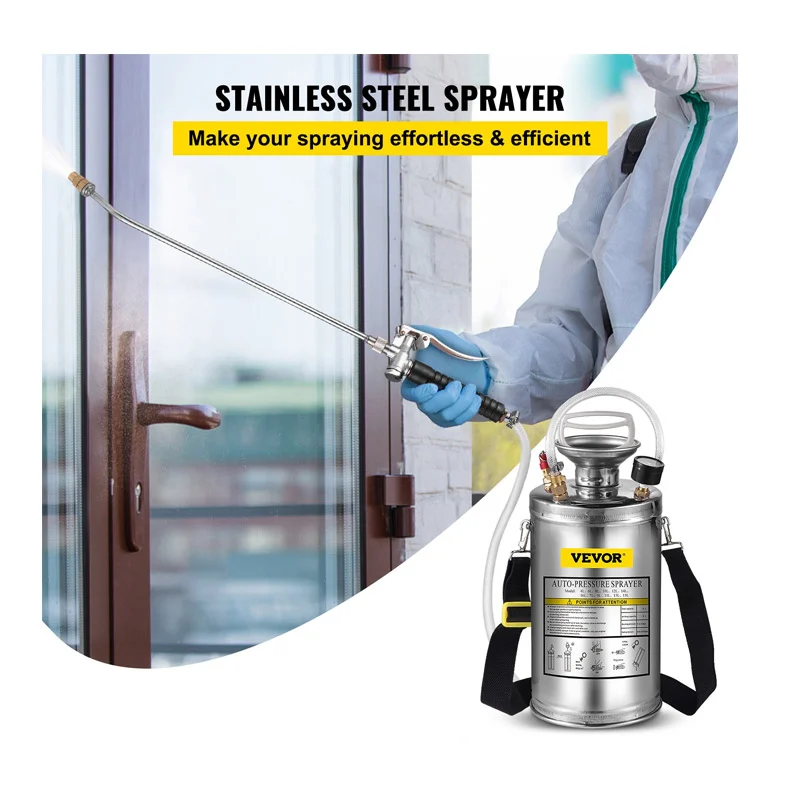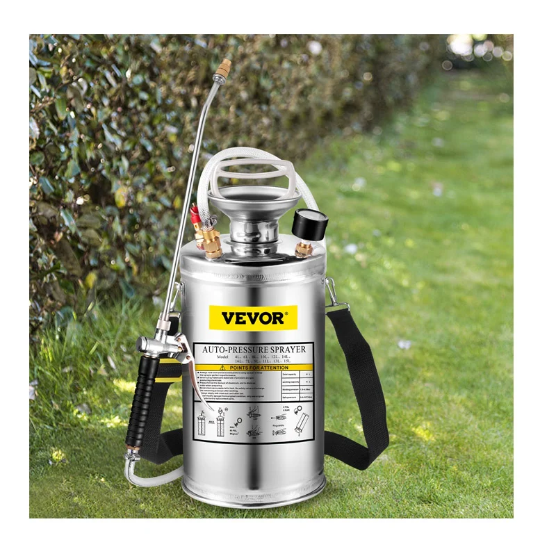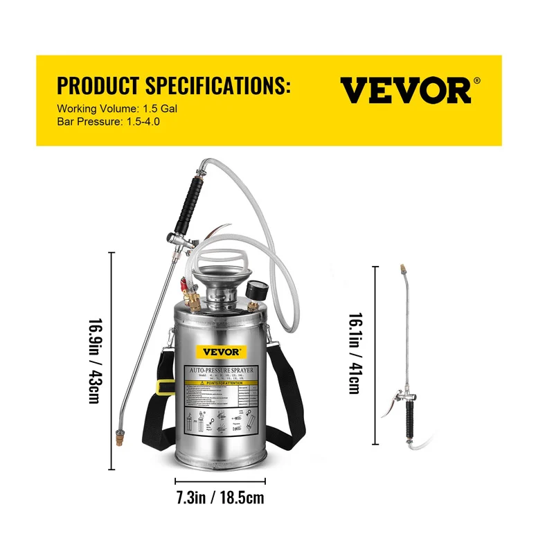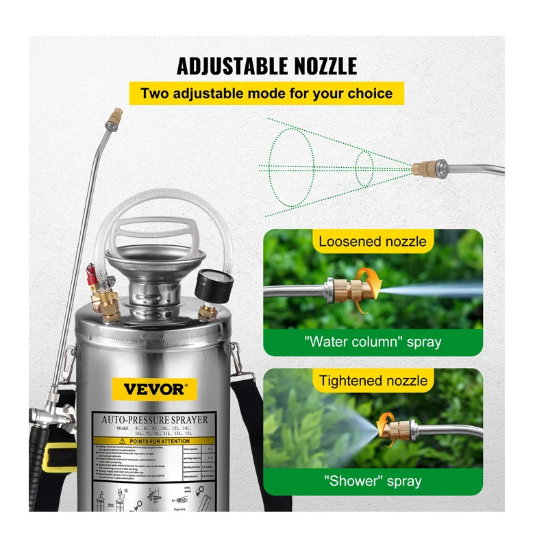 Ο ψεκαστήρας χειρός πίεσης, από την εταιρία VEVOR, είναι κατασκευασμένος από ανοξείδωτο ατσάλι, ανθεκτικός στη σκουριά και έχει χωρητικότητα 6 Lt. Το μπρούτζινο ακροφύσιο μπορεί να ρυθμίσει την ένταση του ψεκασμού νερού από την άμεση έγχυση έως τη λεπτή ομίχλη. Είναι εξοπλισμένος με εύκαμπτο σωλήνα και ράβδο ψεκασμού.