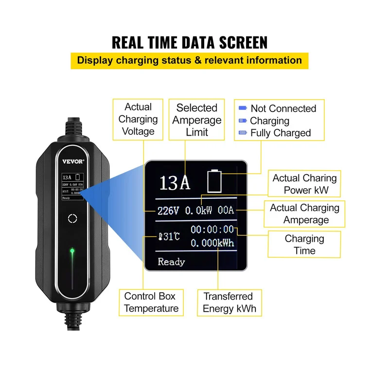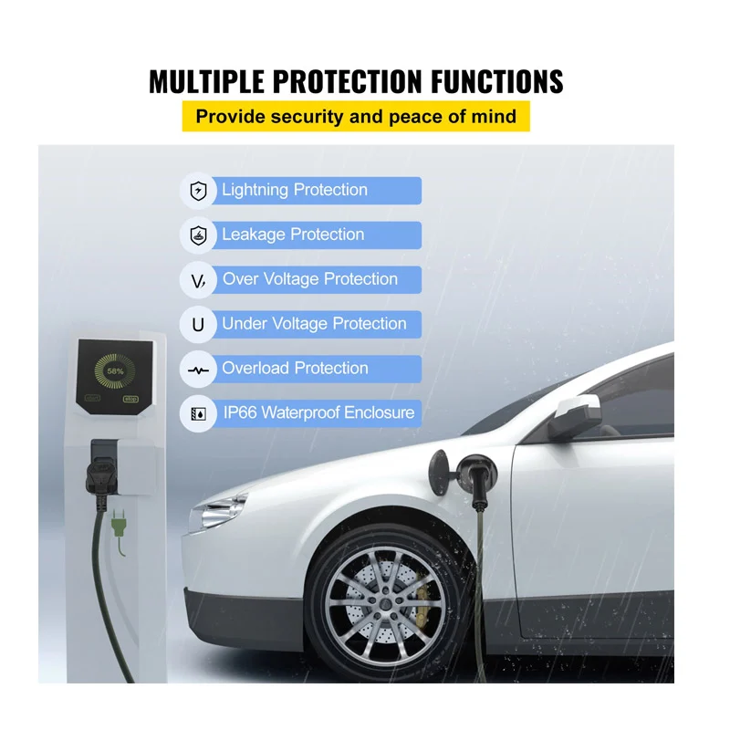 Ο φορτιστής, διαθέτει ένα έξυπνο τσιπ που παρέχει προστασία από κεραυνούς / διαρροές / υπέρταση / υπό τάση / υπερφόρτωση. Το κιβώτιο ελέγχου IP66 και η υποδοχή IP54 EV εξασφαλίζουν τη φόρτιση του αυτοκινήτου σας, ώστε να μην ανησυχείτε. Υιοθετεί μια οθόνη δεδομένων σε πραγματικό χρόνο που εμφανίζει σχετικές πληροφορίες, όπως την πραγματική τάση φόρτισης, το επιλεγμένο όριο έντασης, την πραγματική ισχύ φόρτισης κ.λπ.