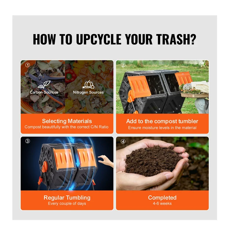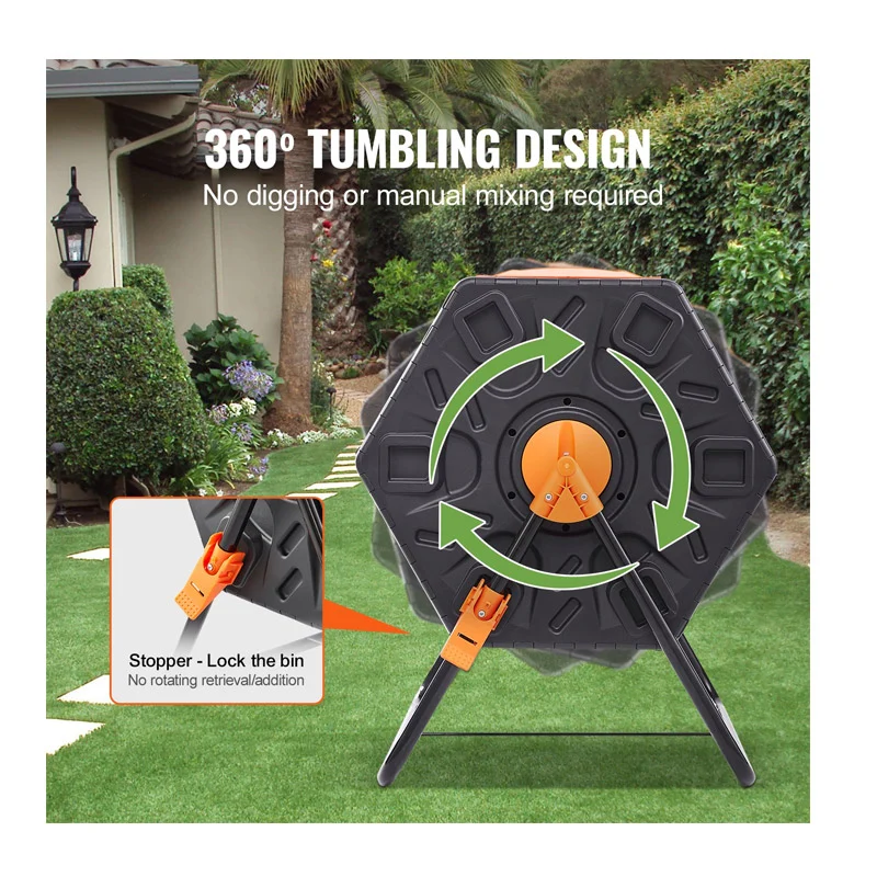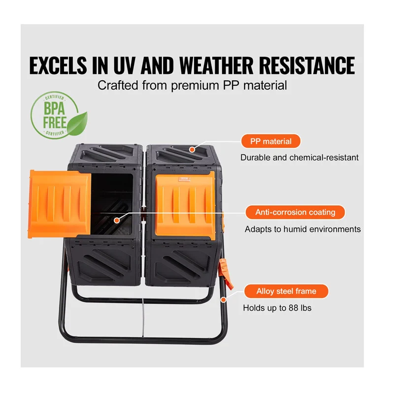 Ο κάδος ταχείας κομποστοποίησης, από την εταιρία VEVOR, είναι κατασκευασμένος από υψηλής ποιότητας υλικά PP και υποστηριζόμενος από στιβαρά μεταλλικά εξαρτήματα, και διαθέτει στιβαρή φέρουσα ικανότητα 40 Kg. Είναι χωρίς BPA, ανθεκτικός στην υπεριώδη ακτινοβολία και ανθεκτικά στις καιρικές συνθήκες, αντέχει το άμεσο ηλιακό φως, τους τυφώνες, τη βροχή, το χιόνι και πολλά άλλα.