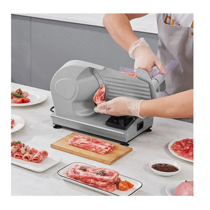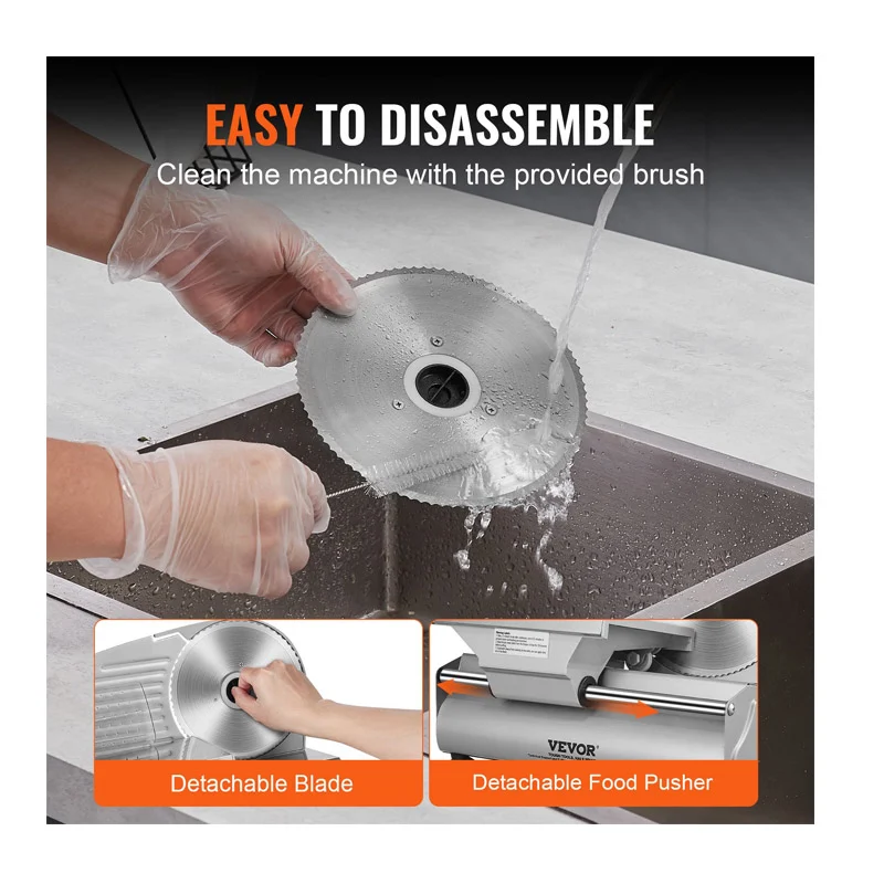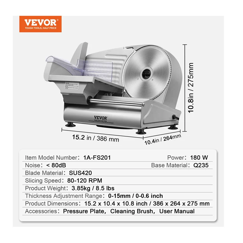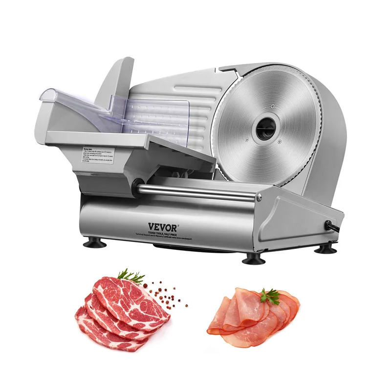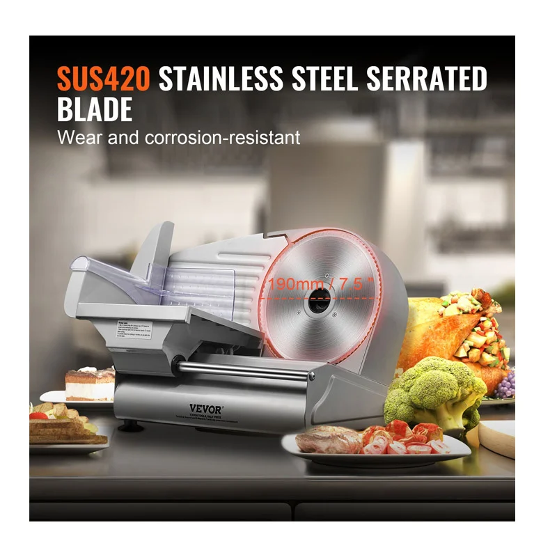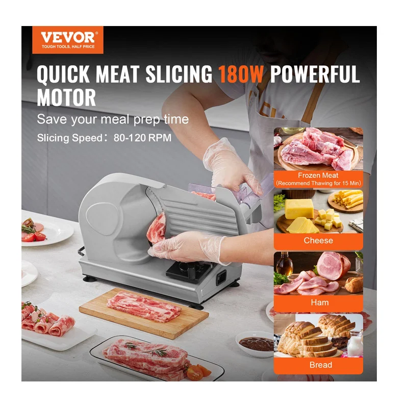 Η ηλεκτρική μηχανή κοπής, από την εταιρία VEVOR, είναι εξοπλισμένη με μια αναβαθμισμένη λεπίδα από ανοξείδωτο ατσάλι SUS420 πλάτους 190 mm, που χειρίζεται αβίαστα διάφορες υφές τροφίμων όπως κατεψυγμένο κρέας, τυρί, ωμό κρέας, μαγειρεμένο κρέας, ζαμπόν και ψωμί. Τροφοδοτείται από έναν κινητήρα 180 W που λειτουργεί στις 80-120 σ.α.λ., επιτρέποντάς σας να κόβετε σε φέτες τα αγαπημένα σας συστατικά αμέσως.