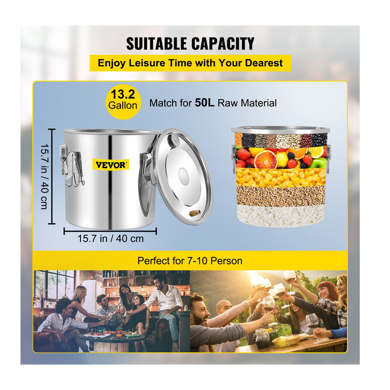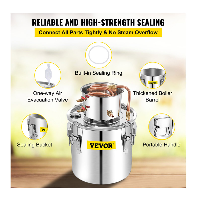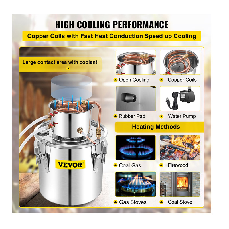 Ο αποστακτήρας, από την εταιρία VEVOR, είναι κατάλληλος για αρχάριους και ειδικούς, με εξαιρετική απόδοση ψύξης. Μπορεί να χρησιμοποιηθεί για την απόσταξη κρασιού φρούτων, νερού, ουίσκι, κονιάκ και αιθέριων ελαίων, και επιτρέπει πολλαπλές μεθόδους θέρμανσης, συμπεριλαμβανομένων σομπών υγραερίου, καυσόξυλων, ηλεκτρικών κεραμικών καλοριφέρ κ.λπ.