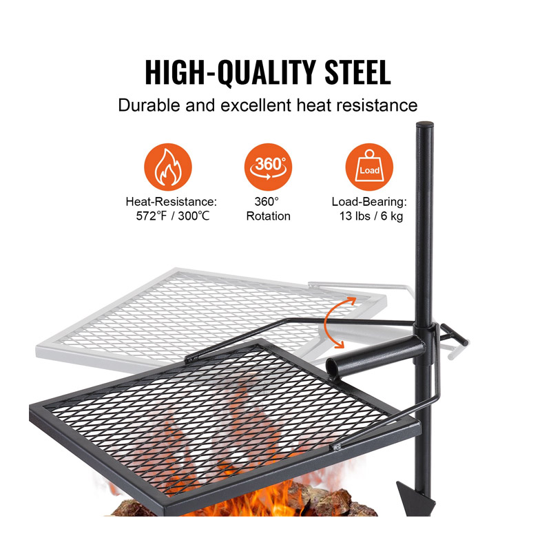 Η σχάρα ψησίματος, από την εταιρία VEVOR, είναι κατασκευασμένη από ατσάλι βαρέως τύπου με στρώση βαφής στην επιφάνεια, που είναι ανθεκτική, κατάλληλη για τρόφιμα, ανθεκτική στη σκουριά και ανθεκτική στη θερμότητα σε υψηλές θερμοκρασίες. Μπορεί να αντέξει θερμοκρασίες έως και 300 °C χωρίς παραμόρφωση και ρωγμές. Σχεδιασμένη με πλέγμα υψηλής πυκνότητας, μπορεί να μεταφέρει τη θερμότητα αποτελεσματικά και να κατανέμει τη θερμότητα ομοιόμορφα.