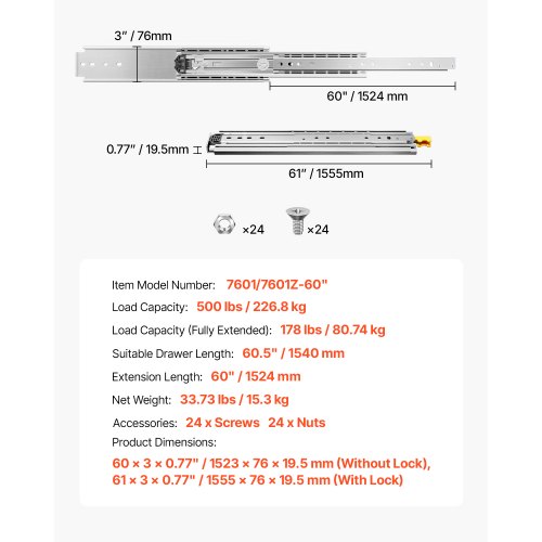 VEVOR Ζεύγος Συρόμενων Ράγων με Απαλό Κλείσιμο και Πλήρη Επέκταση (16-60 ίντσες, 500 lbs) ZXCTHG500B607BSCWV0