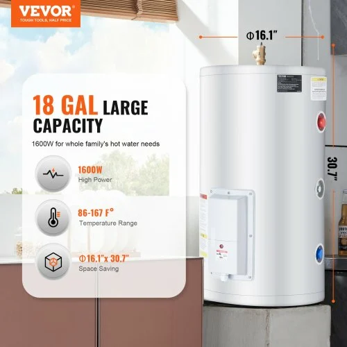 Ιδανικός για οικιακή και επαγγελματική χρήση, ο VEVOR 18 Gallon Ηλεκτρικός Θερμοσίφωνας καλύπτει τις ανάγκες σας για ζεστό νερό με ευκολία και αξιοπιστία.