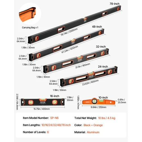 Ανακαλύψτε την απόλυτη ακρίβεια με το σετ επίπεδων VEVOR, το οποίο περιλαμβάνει 6 διαφορετικά μεγέθη: 78, 48, 32, 24, 16 και 10 ίντσες. Κατασκευασμένα από ανθεκτικό αλουμίνιο, αυτά τα επίπεδα είναι ιδανικά για κάθε επαγγελματία και ερασιτέχνη.
