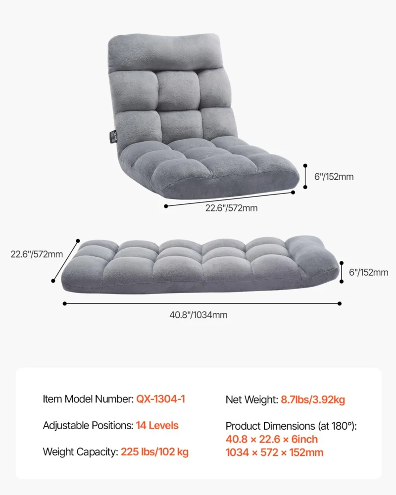 Η VEVOR φέρνει την απόλυτη εμπειρία χαλάρωσης στο σπίτι σου με μια πτυσσόμενη πολυθρόνα δαπέδου με στήριξη πλάτης. Με 14 θέσεις ρύθμισης της πλάτης και μαλακή υφή coral fleece, προσφέρει εξαιρετική άνεση είτε κάθεσαι, είτε ξαπλώνεις.
