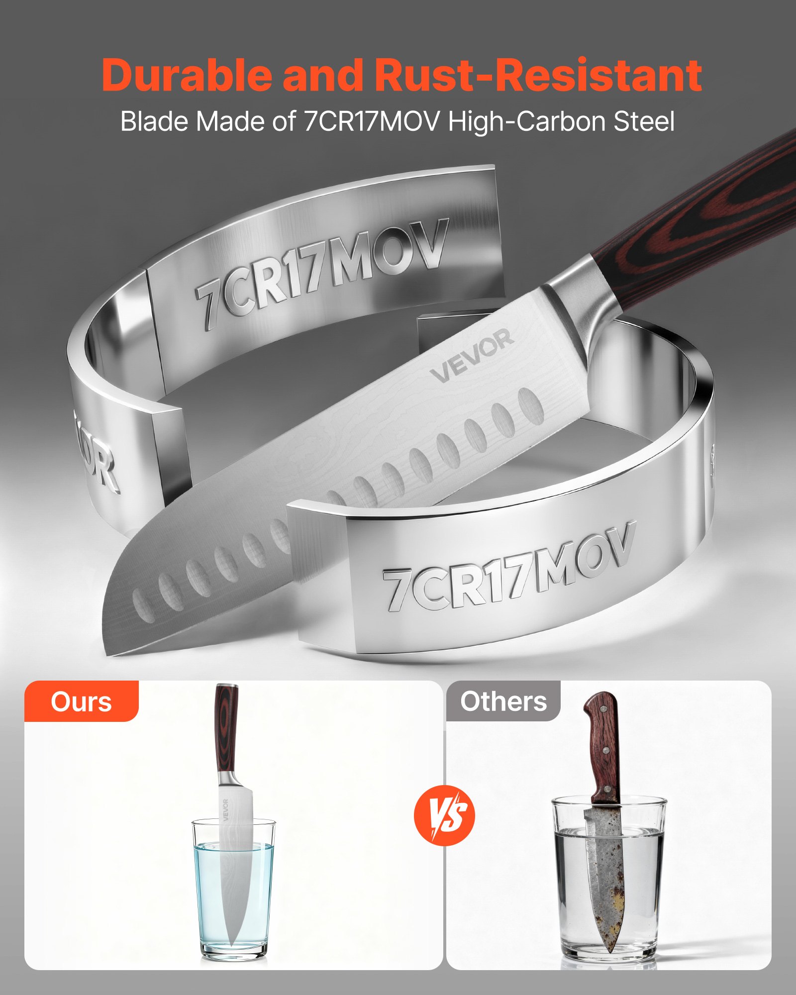 Αντοχή & Αντισκωρική Προστασία: Κατασκευασμένο από ανοξείδωτο χάλυβα υψηλής περιεκτικότητας σε άνθρακα 7CR17MOV, το σετ προσφέρει σκληρότητα και αντοχή, αποτρέποντας σπασίματα. Οι λεπίδες υποβάλλονται σε επεξεργασία για να αντέχουν σε υγρασία και να διαθέτουν διαρκή αιχμηρότητα.