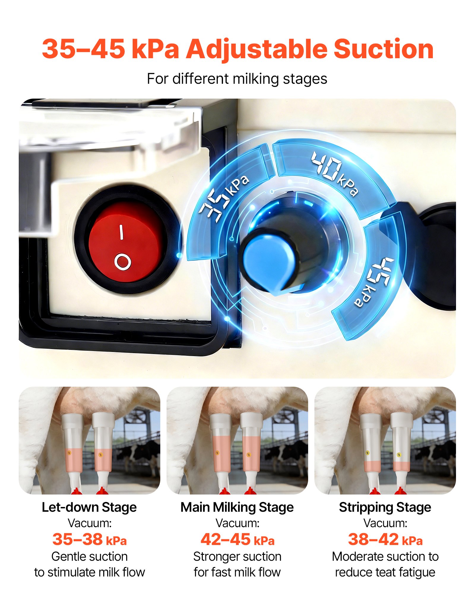 Με εύρος κενού 35-45 kPa, αυτό το σύστημα αρμέγματος παλμικού κενού είναι κατάλληλο για στάδια από διέγερση έως τελικό αρμέγμα. Η ακριβής αναρρόφηση εξασφαλίζει ομαλότερη ροή, ενώ η κατά 25% μεγαλύτερη ισχύς προσφέρει πιο αποτελεσματική απόδοση.