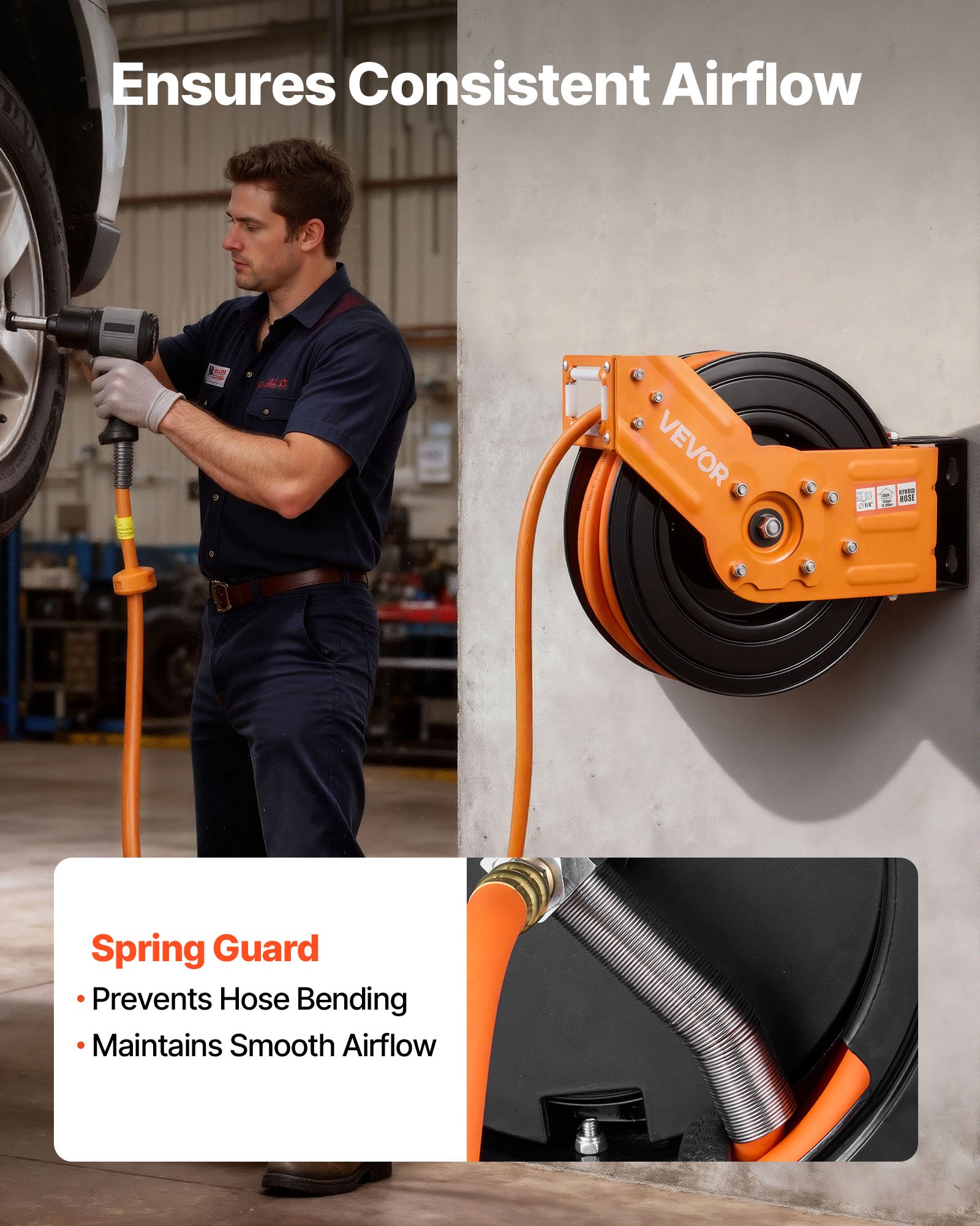 Η ράβδος ανατύλιξης VEVOR περιλαμβάνει 15m x 9.5mm υβριδικό σωλήνα αέρα και σωλήνα σύνδεσης 1.52m, διατηρώντας τον χώρο εργασίας σας τακτοποιημένο και χωρίς μπλεξίματα. Τέλος στους σωλήνες στο δάπεδο, μειώνοντας φθορά και κινδύνους πτώσεων για πιο ασφαλή χρήση.