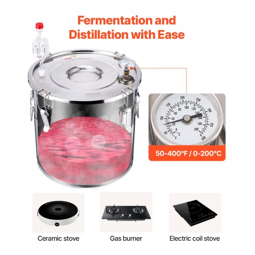 Ο αποστακτήρας διαθέτει θερμόμετρο με εύρος 50°F~400°F / 0℃~200℃ και είναι κατασκευασμένος από ανοξείδωτο χάλυβα SUS201 για αντοχή και μακροχρόνια χρήση.