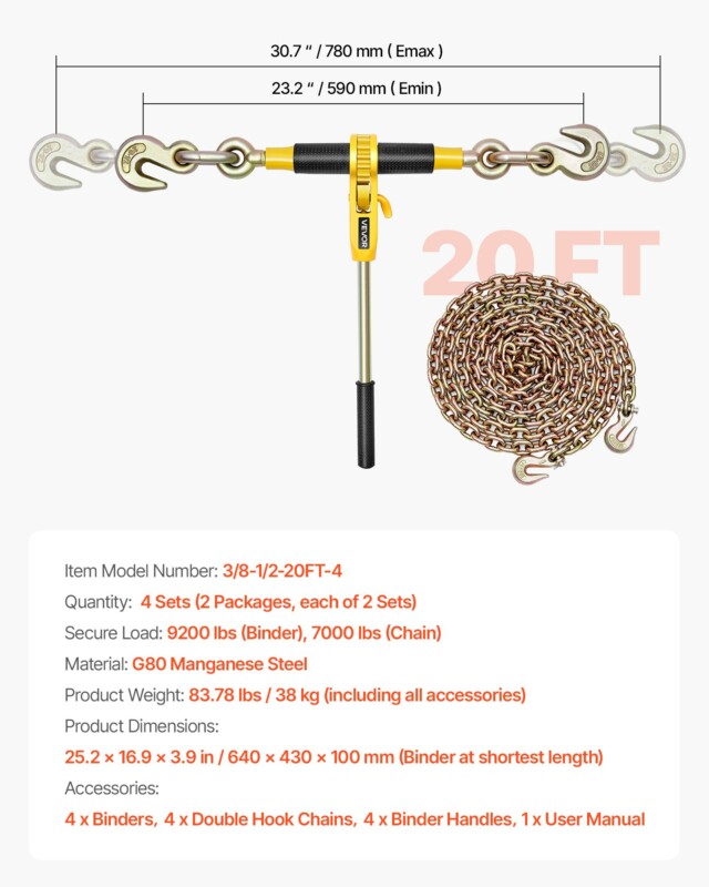 Αριθμός Μοντέλου Προϊόντος: 3/8-1/2-20FT-4, Ασφαλές Φόρτωμα: 9200 lbs (Δεσμευτής), 7000 lbs (Αλυσίδα), Βάρος Προϊόντος: 83.78 lbs / 38 kg (περιλαμβάνοντας όλα τα αξεσουάρ), Ποσότητα: 4 Σετ (2 Πακέτα, το καθένα από 2 Σετ), Υλικό: G80 Χάλυβας Μαγγανίου, Διαστάσεις Προϊόντος: 25.2 x 16.9 x 3.9 in / 640 x 430 x 100 mm (Δεσμευτής στο μικρότερο μήκος)