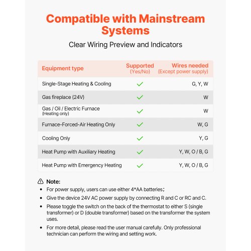 Συμβατά Συστήματα: Αυτός ο οικιακός θερμοστάτης δουλεύει με ενδοδαπέδια θέρμανση, τήξη χιονιού, κλιματιστικά, αντλίες θερμότητας, αέριο και συστήματα θέρμανσης νερού, χρησιμοποιώντας αισθητήρες δαπέδου/εσωτερικού για έλεγχο θερμοκρασίας (απαιτεί ξηρή μπαταρία ή καλωδίωση 24V).