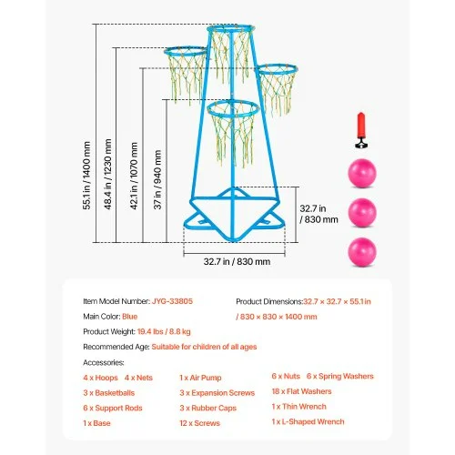 • Ρυθμιζόμενα Ύψη Στεφανιών: 37 in / 940 mm; 42.1 in / 1070 mm; 48.4 in / 1230 mm; 55.1 in / 1400 mm