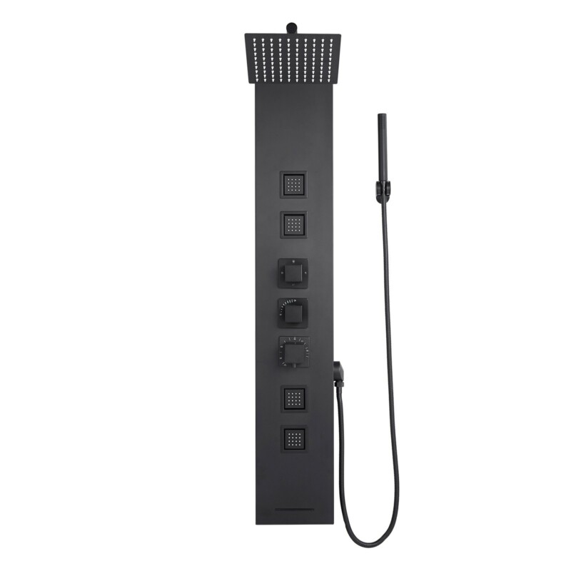 - 4 σε 1 Πολυλειτουργικό Ντους: Κεφαλή τύπου “καταρράκτης”, 4 ρυθμιζόμενα jets μασάζ σώματος, χειροκίνητο τηλέφωνο ντους και στόμιο μπανιέρας — όλα σε μία κομψή κάθετη μονάδα.
