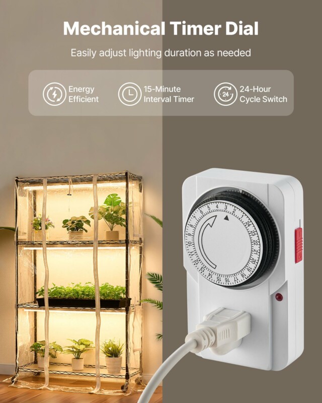 Χρονόμετρο Μηχανικό: Αυτό το εσωτερικό σταντ φυτών διαθέτει ενσωματωμένο προγραμματιζόμενο χρονοδιακόπτη 24 ωρών με διαστήματα των 15 λεπτών για εύκολη λειτουργία. Ορίστε μία φορά για αυτόματο άνοιγμα/κλείσιμο καθημερινά, εξασφαλίζοντας σταθερά, ενεργειακά αποδοτικά κύκλους φωτισμού για τα φυτά σας.