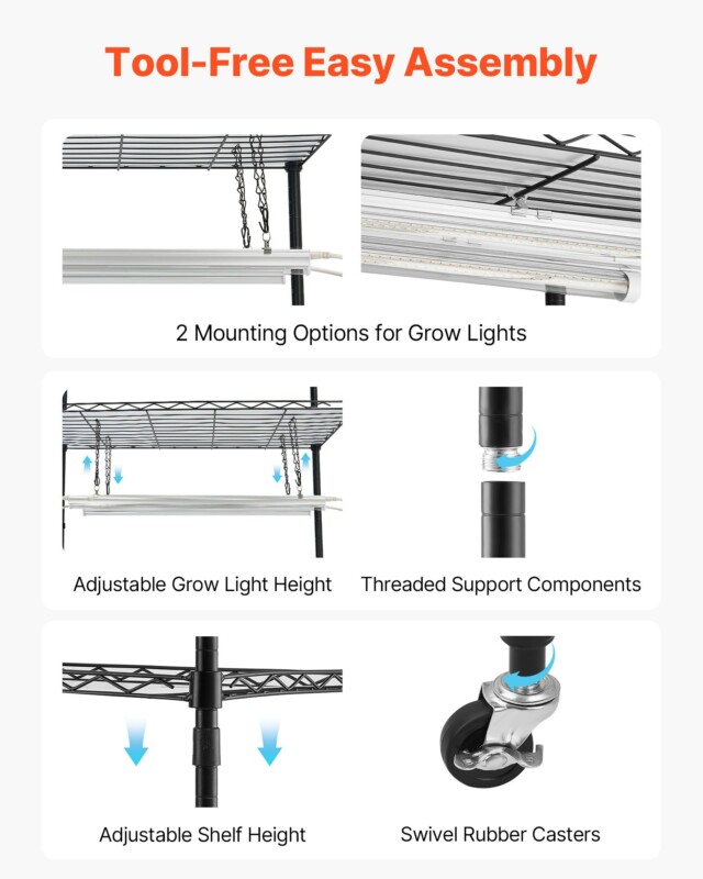 Εύκολη Συναρμολόγηση & Μετακίνηση: Το εσωτερικό θερμοκήπιο με φωτισμό καλλιέργειας έρχεται με όλα τα απαραίτητα αξεσουάρ για γρήγορη και χωρίς εργαλεία συναρμολόγηση. Οι ρυθμιζόμενες ράφια επιτρέπουν την τοποθέτηση φυτών διαφορετικού ύψους. Οι τέσσερις γυριστές τροχοφόρες βάσεις καθιστούν την μετακίνηση της βάσης παιχνιδάκι.