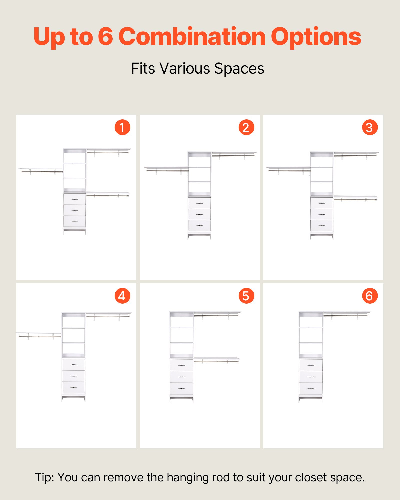 Οι ράβδοι μπορούν να περιστραφούν ή να αφαιρεθούν για να προσαρμοστεί στο χώρο της ντουλάπας σας. Πολλαπλές διατάξεις το καθιστούν κατάλληλο για υπνοδωμάτια, πλυσταριά ή walk-in closets.