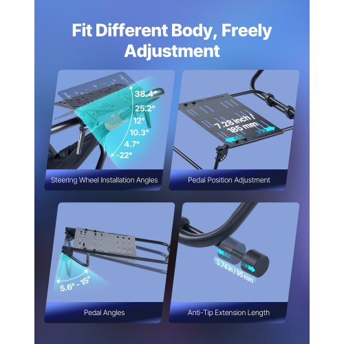 Πλήρως Ρυθμιζόμενος Σχεδιασμός: Το τιμόνι ρυθμίζεται σε 6 γωνίες, ενώ τα πεντάλ προσφέρουν 4 γωνίες και θέσεις εμπρός/πίσω. Ράβδος κατά της ανατροπής κρατά τα πάντα στη θέση τους. Αυτό το σταντ προσομοιωτή σας επιτρέπει να βρείτε την ιδανική θέση οδήγησης για κάθε αγώνα.